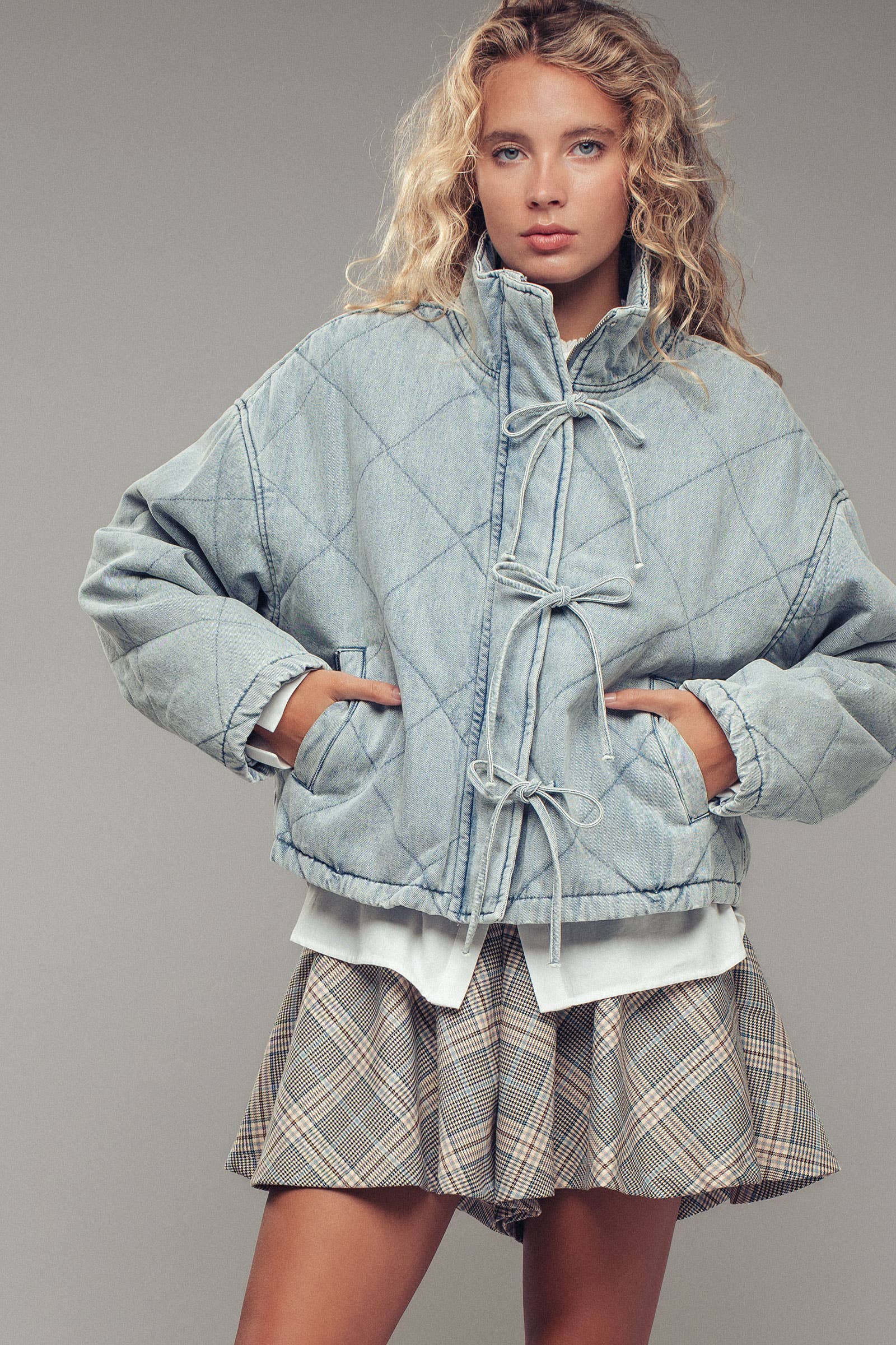 Oversized Quilted Denim Tie-Front Jacket: LT DENIM