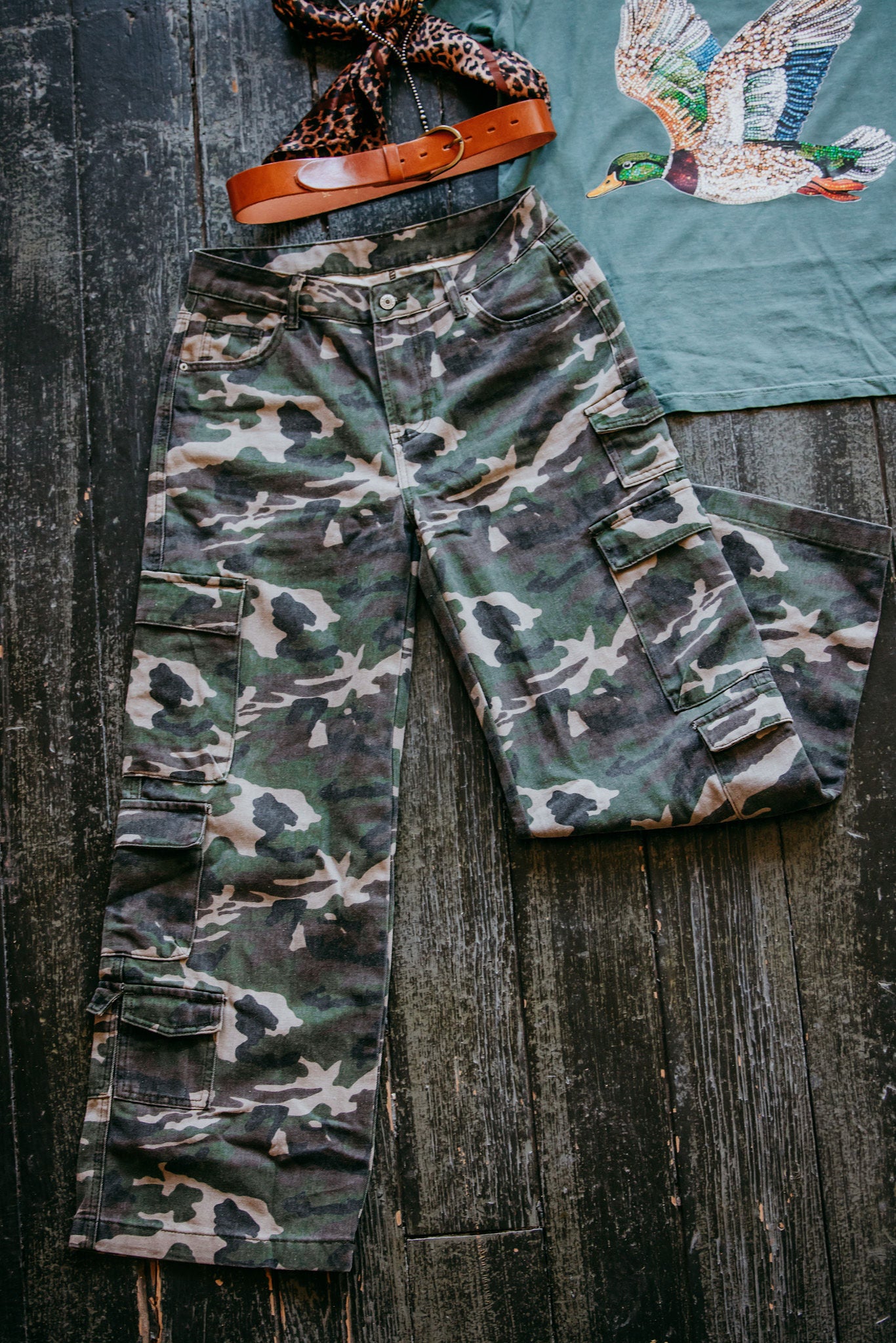 Camo Denim Cargo Wide Leg Pants