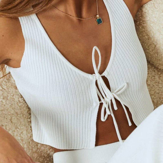Knit Pit Stripe Lace Up Tank Top: White